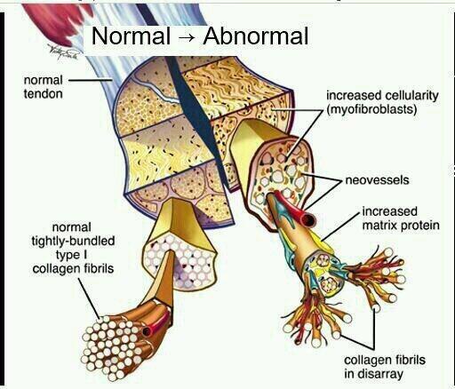 El ejercicio enérgico induce la formación de colágeno tipo I y aumenta los niveles peri tendinosos de varios mediadores de la vasodilatación y de la inflamación. El ejercicio fisiológico aumenta la fuerza del tendón, pero cuando se supera el umbral se producen micro lesiones. Si el tendón dispone de tiempo suficiente para recuperarse, el mecanismo de curación se impondrá con una reparación completa. Sin embargo, si el tiempo de recuperación es demasiado corto o el flujo sanguíneo es inadecuado, el esfuerzo repetitivo provocará micro lesiones dentro del tendón; existe una línea muy delgada entre ejercicio físico saludable y no saludable.