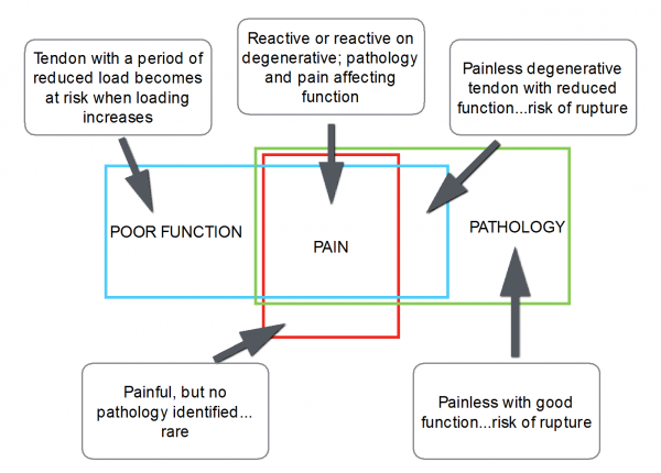 "Tendon pain is baffling for clinicians and scientists alike. Difficult to understand why it is so persistent and why it comes and goes with little reason. Scientifically this translates to the absence of a clear mechanism that can explain the clinical features of tendon pain. It is therefore no surprise that treatments for tendon pain are often ineffective" (Ebonie Rio 2013 The tendon pain: Physiological or pathophysiological?)