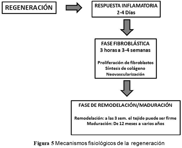 El proceso de curación se lleva a cabo mediante la fase de respuesta inflamatoria, fase de reparación fibroblástica y la fase de remodelación/maduración. Inmediatamente después de la lesión se inicia una cascada de acontecimientos fisiopatológicos necesarios para la reparación del tejido lesionado.