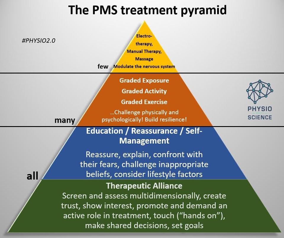 Ayudar al paciente a exponerse al miedo (ejercicio) de una forma gradual y controlada (con un programa de ejercicio gradual) en un entorno seguro (en clínica) y con un fisioterapeuta, puede desensibilizarlo y transferir ese éxito a casa y a su trabajo. Éste es probablemente uno de los efectos más poderosos del contacto con un fisioterapeuta. Paul Watson.